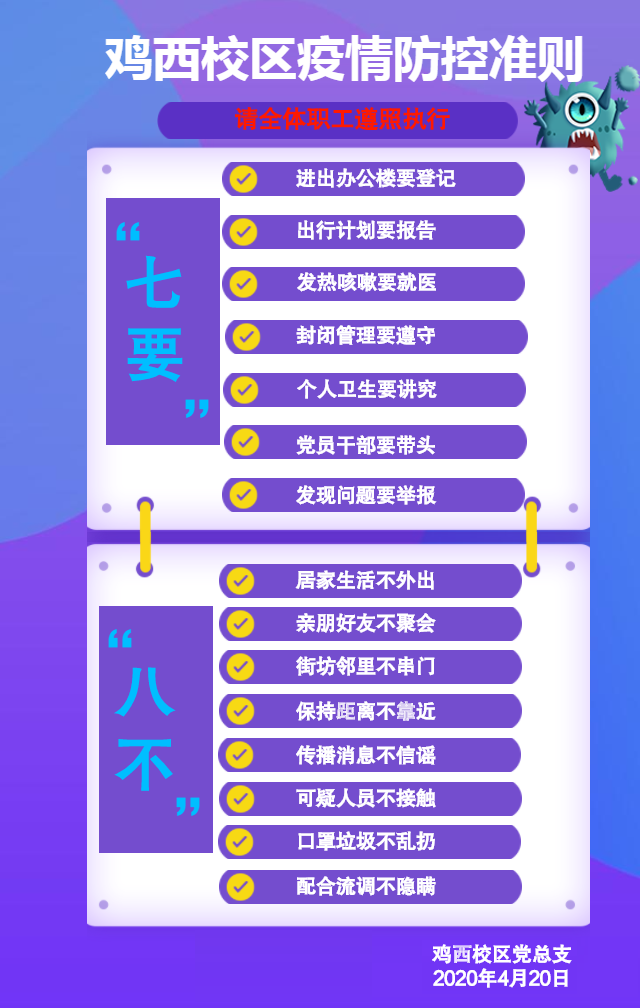 为了应对疫情防控新形势,落实公司4月19日“党委常委会暨应对疫情工作领导小组会议”要求,鸡西校区党总支4月20日上午召开班子会议,制定《鸡西校区疫情防控准则》(“七要八不”)如下,请全体职工遵照执行。