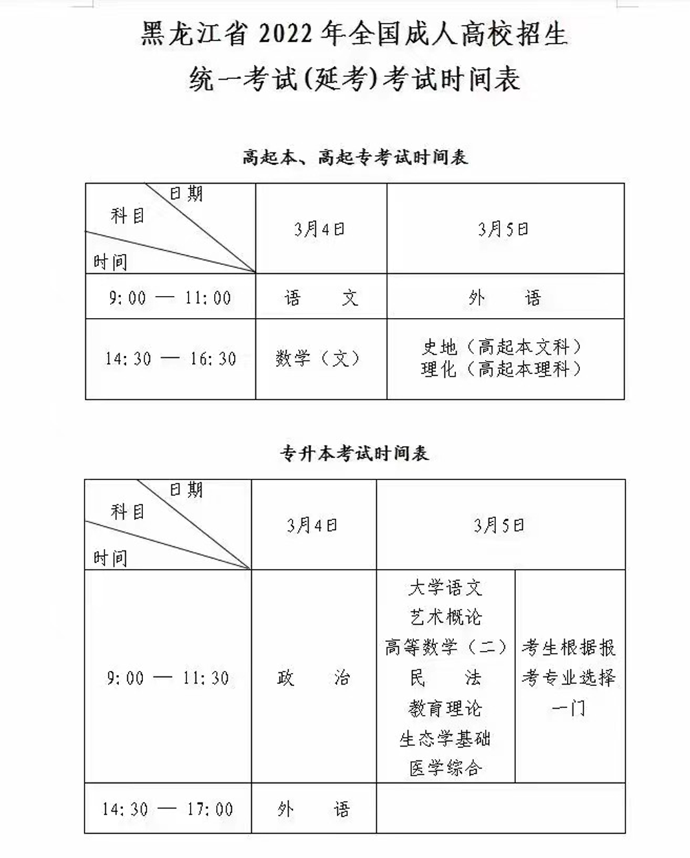 附件1:黑龙江省2022年全国成人高校招生统一考试(延考)考试时间表