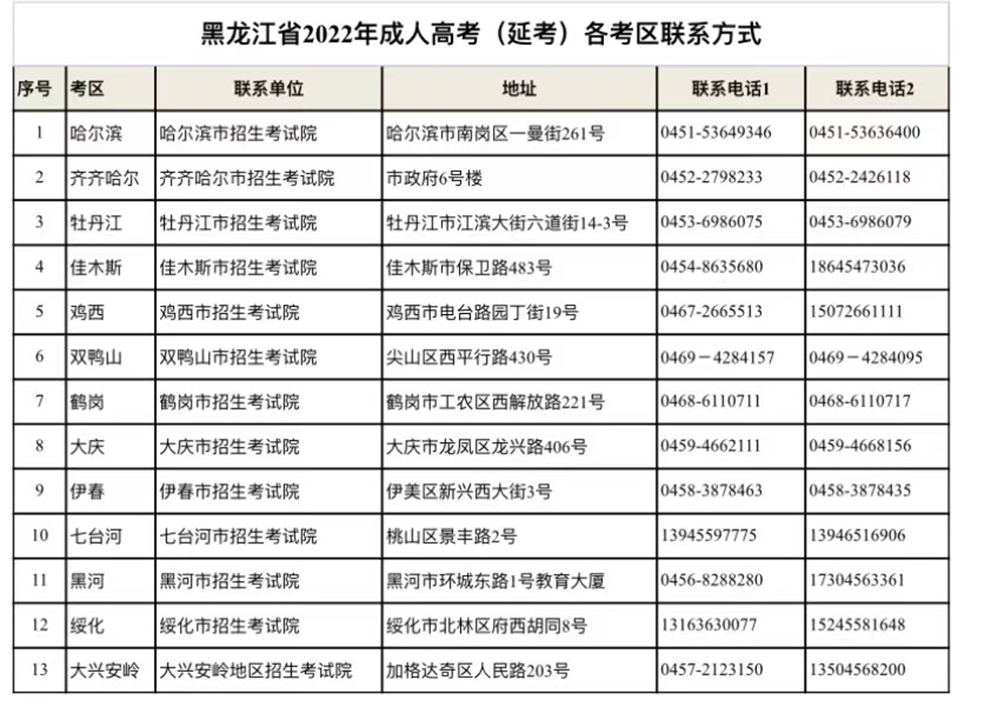 附件2:黑龙江省2022年成人高考(延考)各考区联系方式